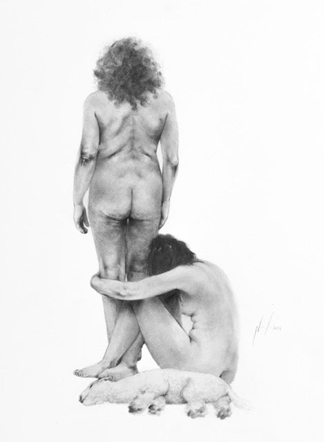 I began researching Lot's wife as an archetype for Lena, one of the foster mothers I had during my time in care, portrayed in my drawing as the standing figure, which the younger woman representing me, is clinging to.
